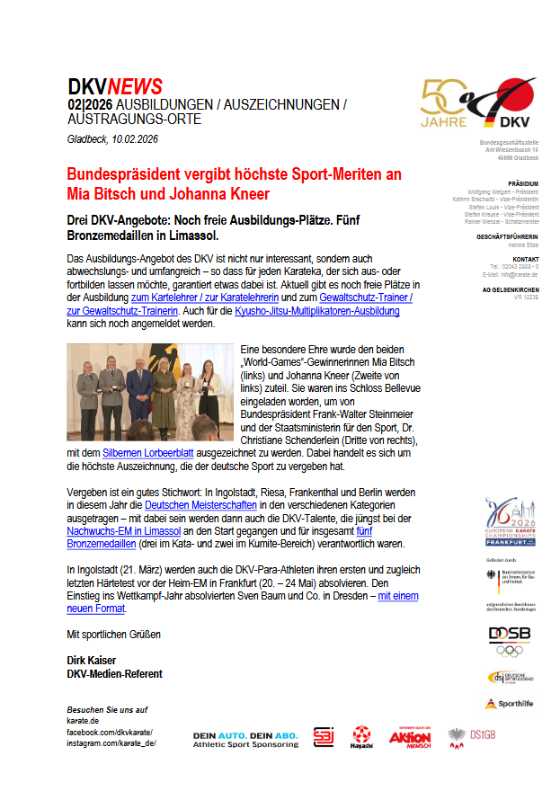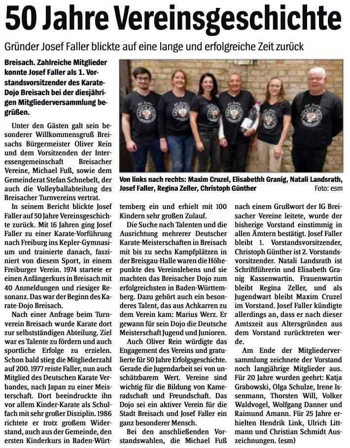 Für besondere Verdienste und 50-jährige ehrenamtliche Vereinstätigkeit erhielt das Karate Dojo Breisach die Ehrenurkunde mit Ehrenmedallie in Gold vom Deutschen Karate Verband. J. Faller erhielt für seine ehrenamtliche Tätigkeit die Ehrenurkunde. Vom BSB-Präsidenten erhielt Faller den Ehrenteller mit dem Badischen Greifen in Silber, dem Wappentier des Hauses und Landes Baden.Vor allem dankte Herr Fleischer Faller für seinen unermüdlichen Einsatz und ehrenamtliche Tätigkeit, so wie den Großartigen Erfolgen auf Landes- und Bundesebene.