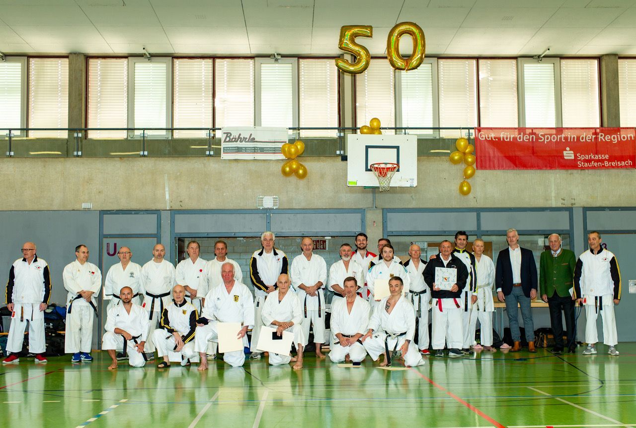 Anlässlich unseres 50-jährigen Jubiläums waren wir Ausrichter des Trainermeetings des Karate Verbandes Baden-Württemberg. Nahezu 300 Karatekas aus ganz BaWü folgten der Einladung nach Breisach in der Breisgauhalle, um sich in den einzelnen Disziplinen weiterzubilden.
